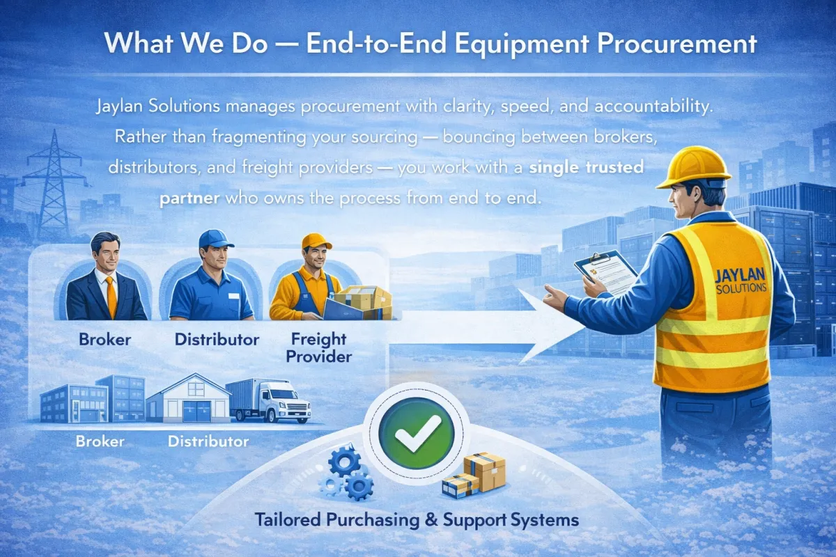 When critical equipment needs to arrive on time — and without unnecessary delays, red tape, or hidden costs — Jaylan Solutions delivers a strategic procurement solution that moves fast and performs reliably. We combine deep industry expertise, an unmatched network of suppliers, and logistics precision to source the right equipment for your project — whether you’re facing tight deadlines, market shortages, or complex specifications.